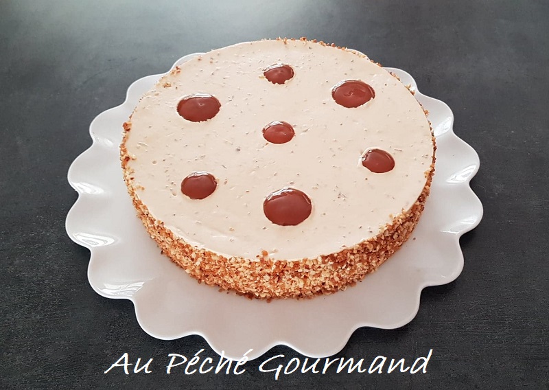 Démouler le bavarois, retirer le rhodoïd, et appliquer le pralin sur tout le tour à l’aide d’une spatule.