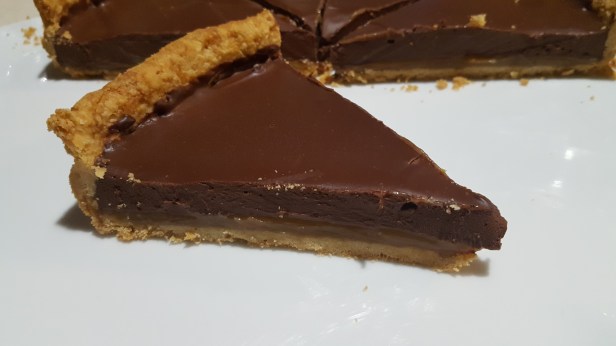 La chaleur de la crème doit faire fondre le chocolat. Remuer bien à la cuillère en bois pour qu’il se mélange de façon homogène à la crème. Si jamais vous voyez qu’il reste de gros morceaux, mettre la casserole sur le feu minimum et tenir bien remué, stopper la source de chaleur dès que le chocolat a fondu. Lorsqu’il est tiède, le verser sur le caramel (qui lui doit être bien refroidi).