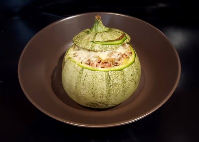Farcir les courgettes, ajouter le gruyère râpé et remettre les chapeaux.