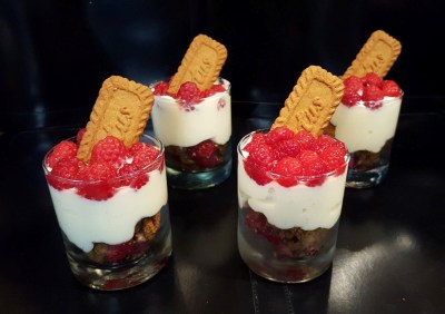 Surmontez le tout d’une couche de crème au mascarpone. Renouvelez cette opération en alternant biscuits spéculoos, framboise et crème. À la fin du montage, vous pouvez déposer une framboise en guise de décoration.