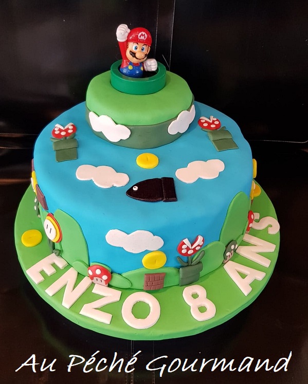 Sponge cake (recette : ici ) parfumé au caramel beurre salé, garni avec de la confiture de pêches puis recouvert de pâte à sucre façon Mario
