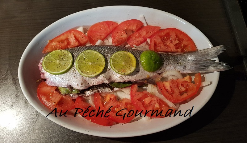 Disposer sur cette diagonale la moitié du citron coupé en rondelles, poser le poisson dessus après lui avoir rempli le ventre de thym et laurier.